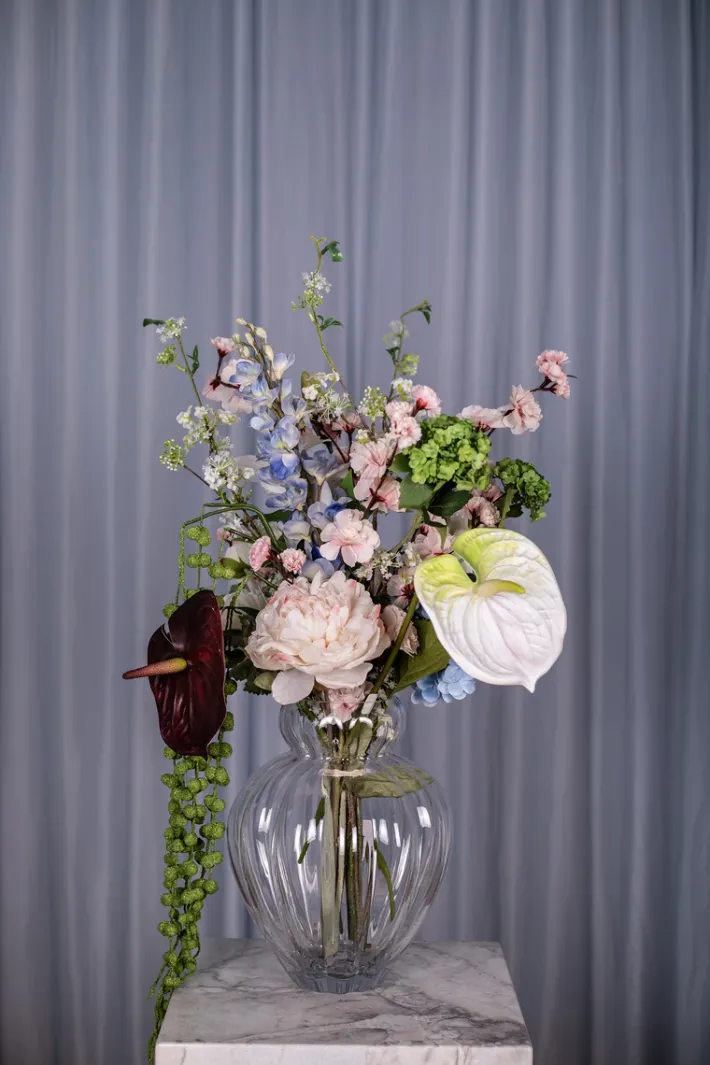 Forny dit hjem med vores eksklusive kunstneriske blomsterbuket. Med sin enestående kvalitet, naturtro udseende og smukke kombination af blomster, vil den tilføje en farverig touch til din indretning.