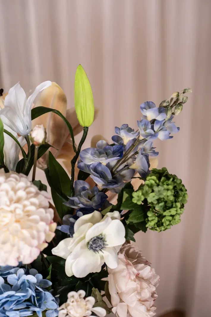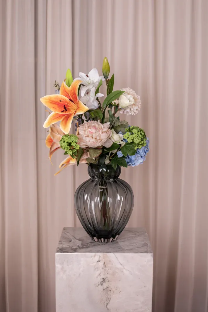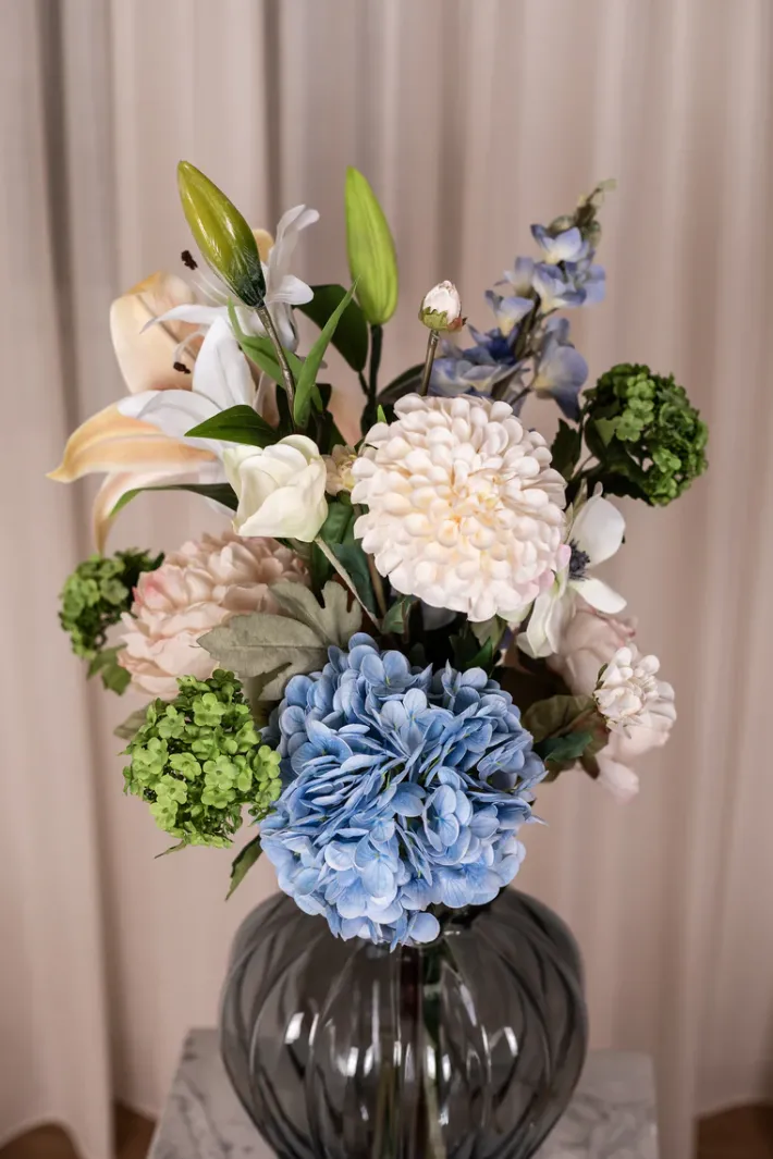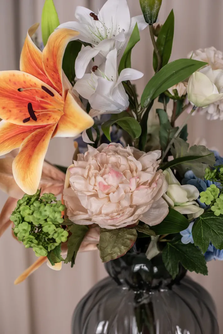 Forny dit hjem med vores eksklusive kunstneriske blomsterbuket. Med sin enestående kvalitet, naturtro udseende og smukke kombination af blomster, vil den tilføje en farverig touch til din indretning.