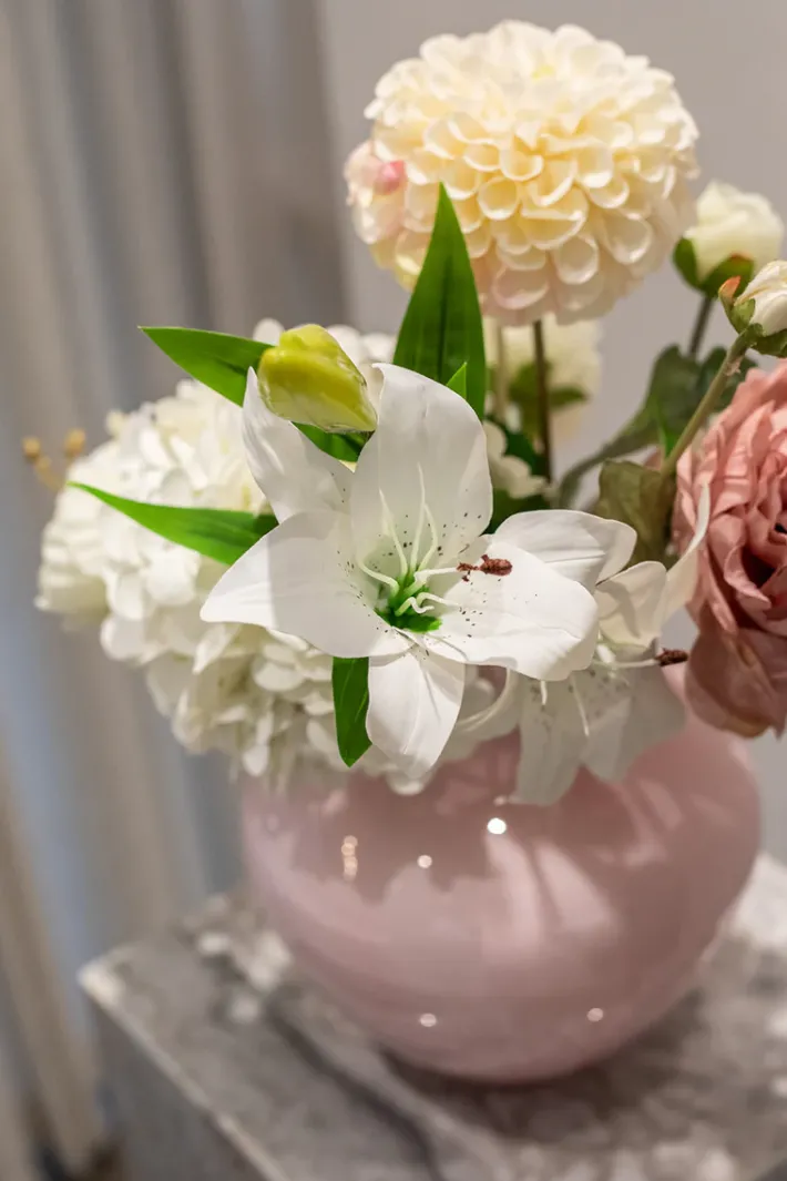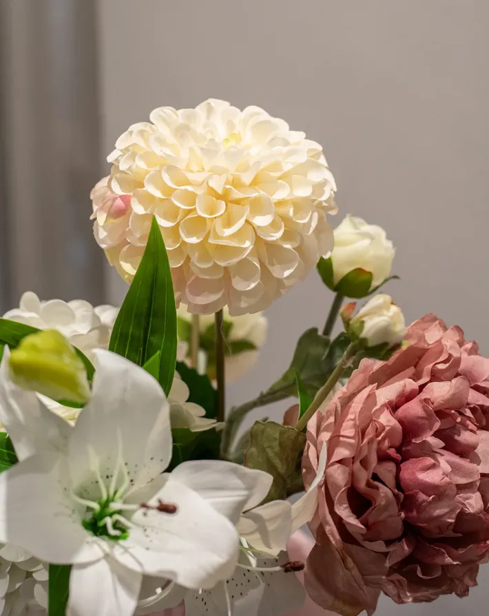 Forny dit hjem med vores eksklusive kunstneriske blomsterbuket. Med sin enestående kvalitet, naturtro udseende og smukke kombination af blomster, vil den tilføje en farverig touch til indretning.