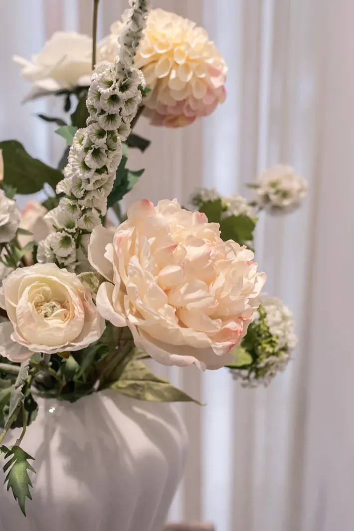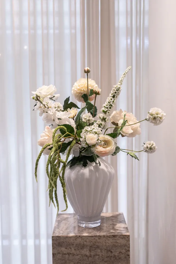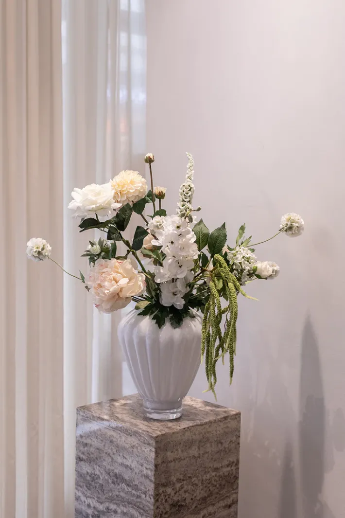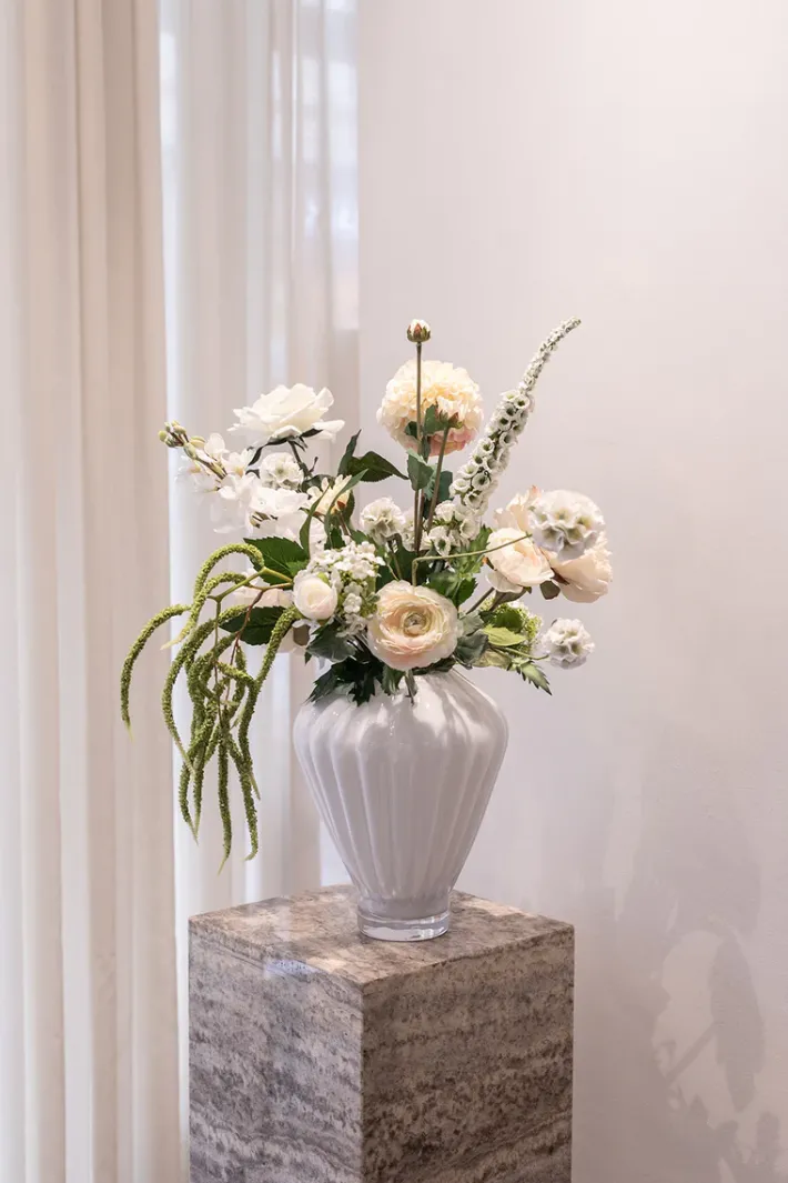 Buketten er stylet i den mundblæste Evelyn vase i farven opal og i medium størrelsen.
