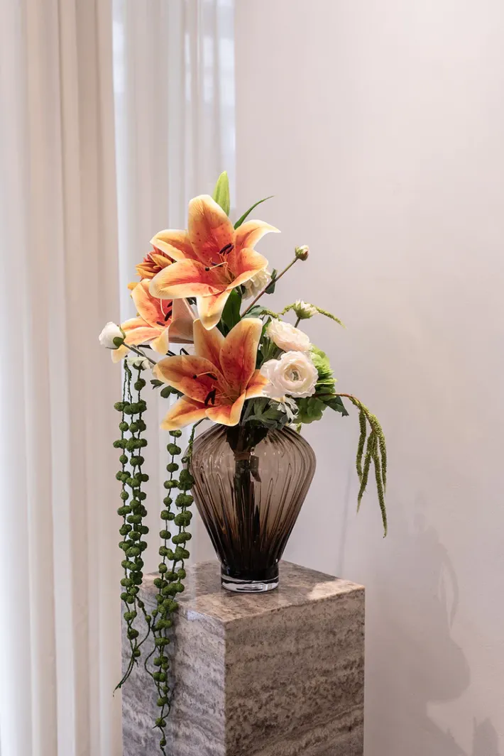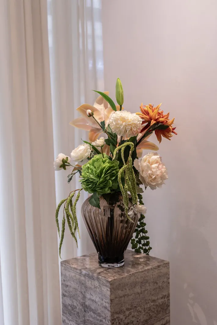 Buketten er stylet i den mundblæste Evelyn vase i farven topaz og i medium størrelsen.