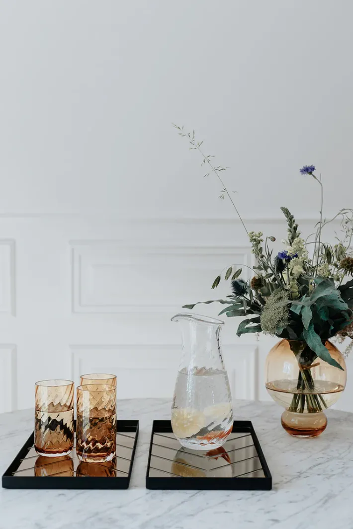 Meadow kollektionen er mundblæst og produceret i Europa. På grund af den håndlavede process er hver kande unik. Dette betyder at der kan forekomme variationer i form af luftbobler, vægt og mønster fra kande til kande, hvilket er en del af håndværket, som vi elsker, værdsætter og beundrer.